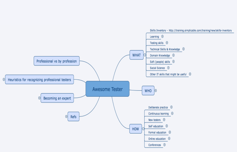 At TestBash Manchester I did a presentation titled “Great Resources - A road to awesomeness”. In this talk I tried to explain how testers can become awesome. I talked about learning and testing skills. To prepare this talk I created a mind map to list skills and ways to learn. The mind map is here and will be continuously updated in the future. Let me know if you have things to add.