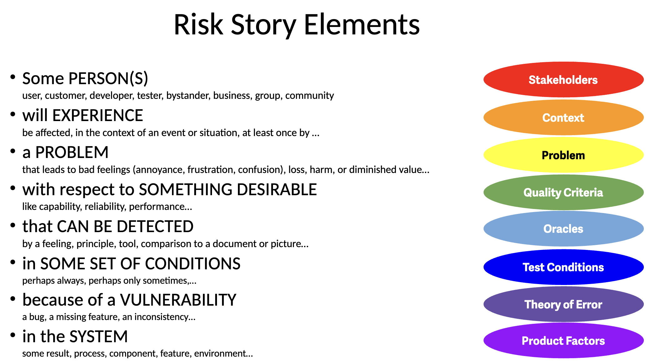 Risk is about people using or depending on software. So, the story of what goes wrong is about people with a problem. It is not a “cold” analysis where we calculate failure chance x impact. Someone may be harmed because of something that might go wrong, due to some vulnerability in the product that is exploited by some threat.
