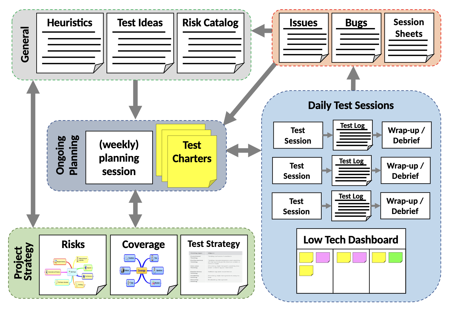 Using a coverage outline in a mind map or a simple spreadsheet, I keep track of what I have tested. My charters (a one to three sentence mission for a testing session) help me focus, my wrap-up and/or debriefings help me determine how good my testing was. My notes and the sessions sheets keep track of what I have done in my testing. Like in scrum, I use “standup” meetings to plan my testing. In these meetings we discuss progress, risks, priorities and charters to be executed. This helps us to make sure we do the best testing we can do continuously.