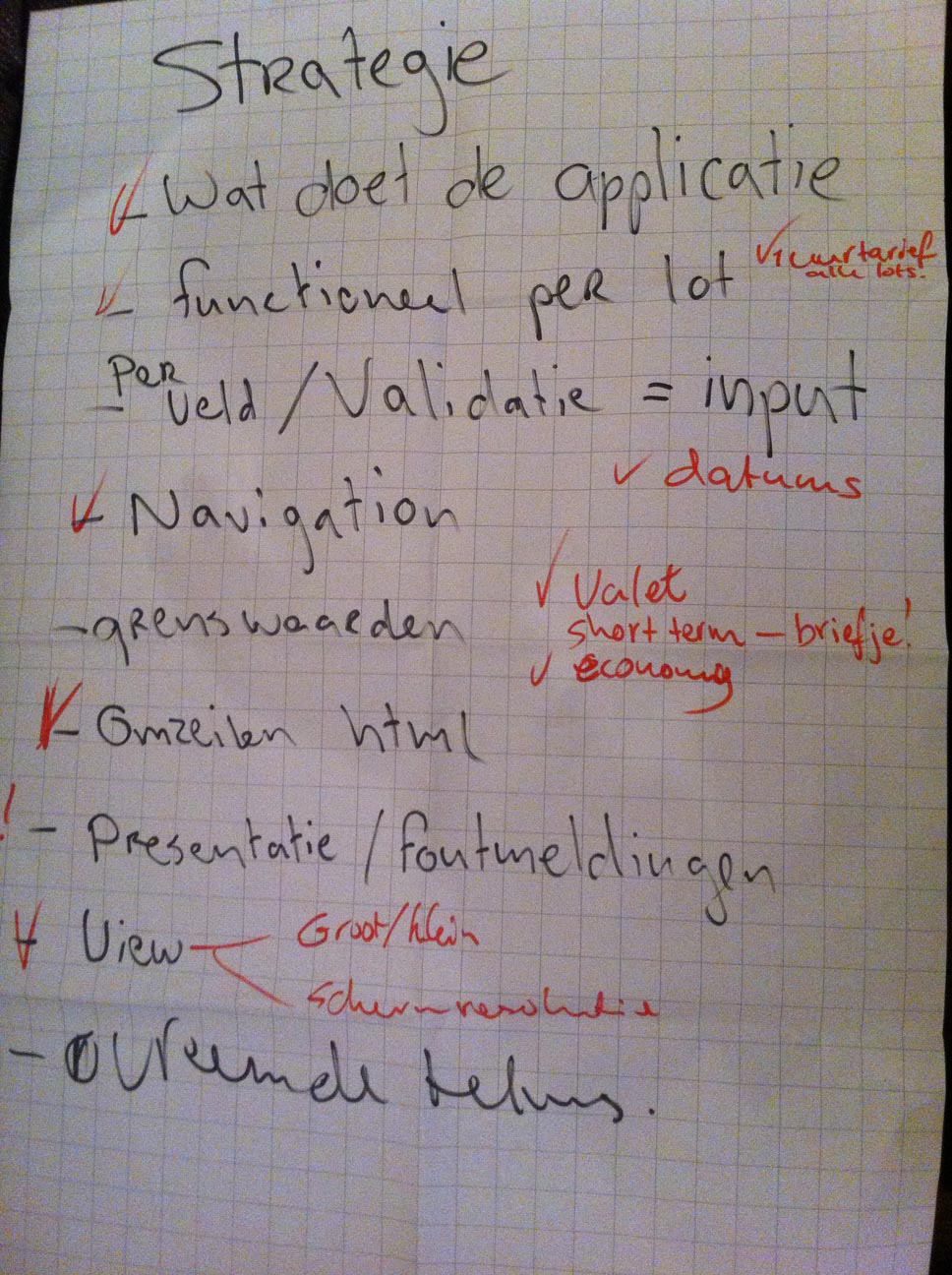 After a flip over with the “test strategy” was created by one of the participants, testing was more focussed. But still I noticed that it was difficult for the participants to test in pairs (communication) and keep focussed without scripted tests (structure). None of the pairs debriefed or communicated with the next group. To fill this “gap” I asked every pair after their time was up, if I could “tick off” one of the items from the test strategy.