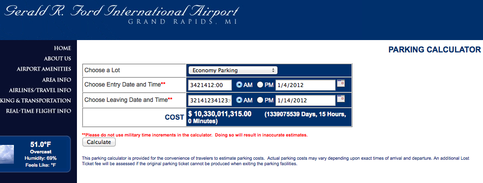 Test parking calculator Gerald R.Ford International Airport using SFDPOT and the Test Heuristic Cheat Sheet).