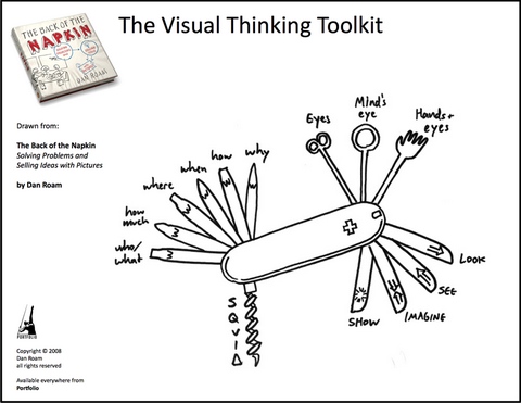 His philosophy is that every problem can be solved with a simple drawing. In his book he introduces four steps of visual thinking, five questions that help focus and six ways of seeing. Try it and see if it helps you.